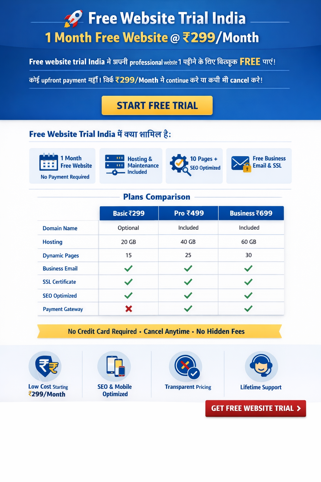 🚀 Free Website Trial India – 1 Month Free Website @ ₹299/Month